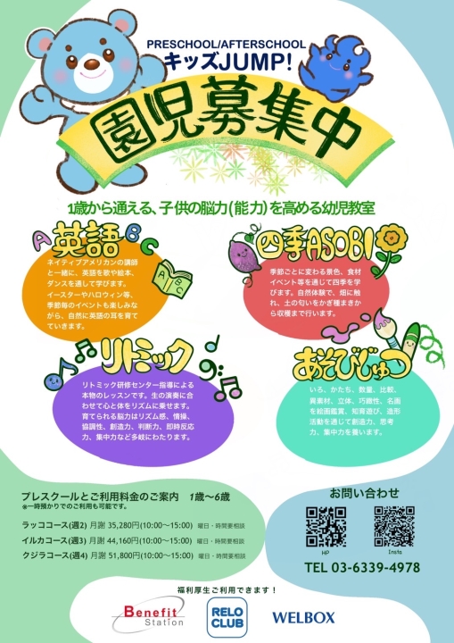 ※いずれのコースも日替わりで英語教室・リトミック教室・あそびじゅつ教室・四季ASOBI教室が含まれています。
